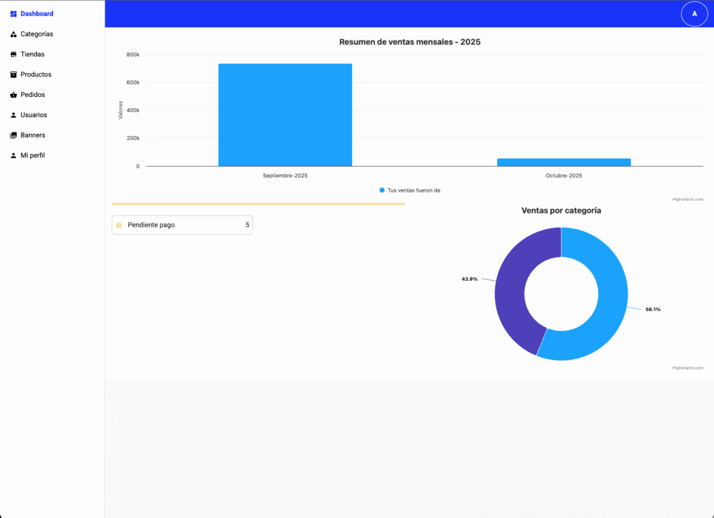 - Dashboard with key metrics of sales, users and marketplace activity.